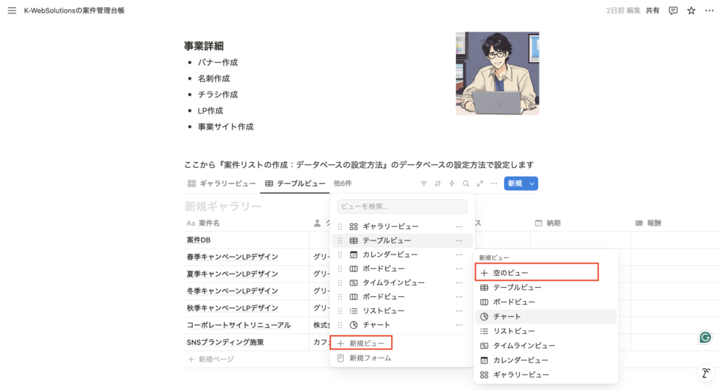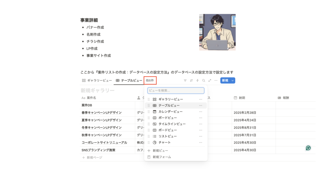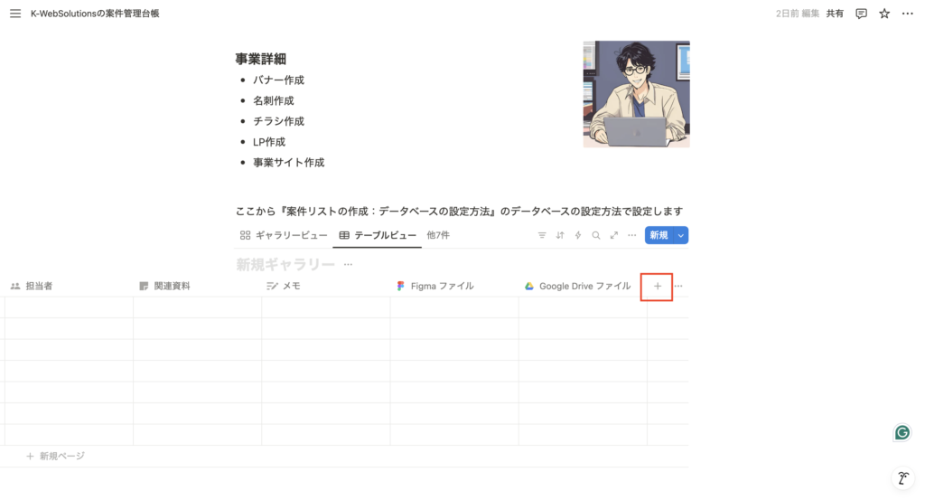 ・Notionの案件リスト(データベース)を開きます。 - 右端の「+」をクリック