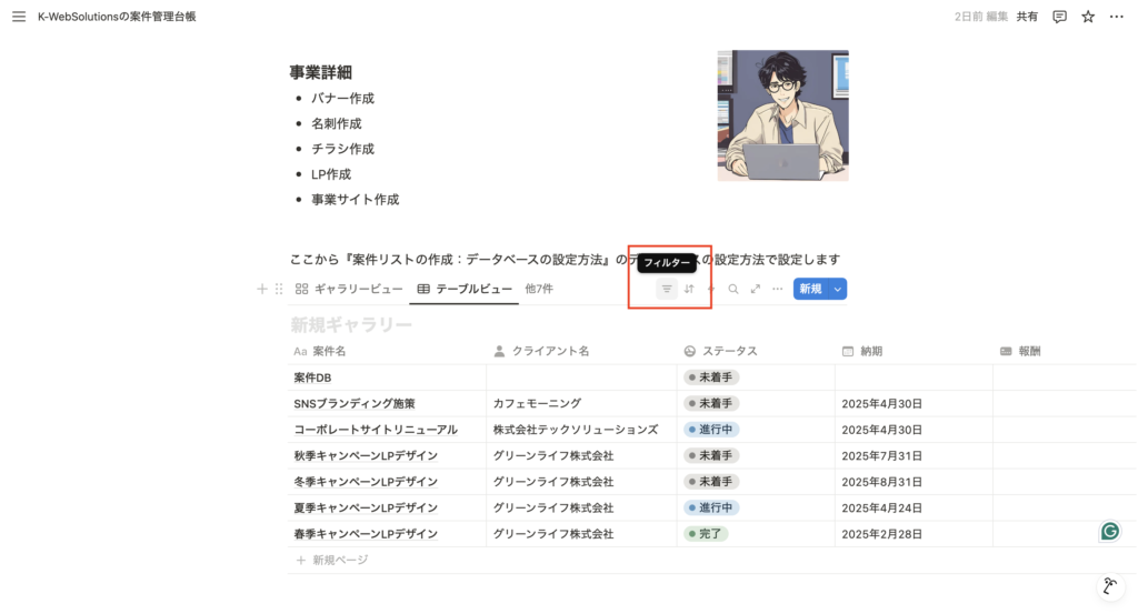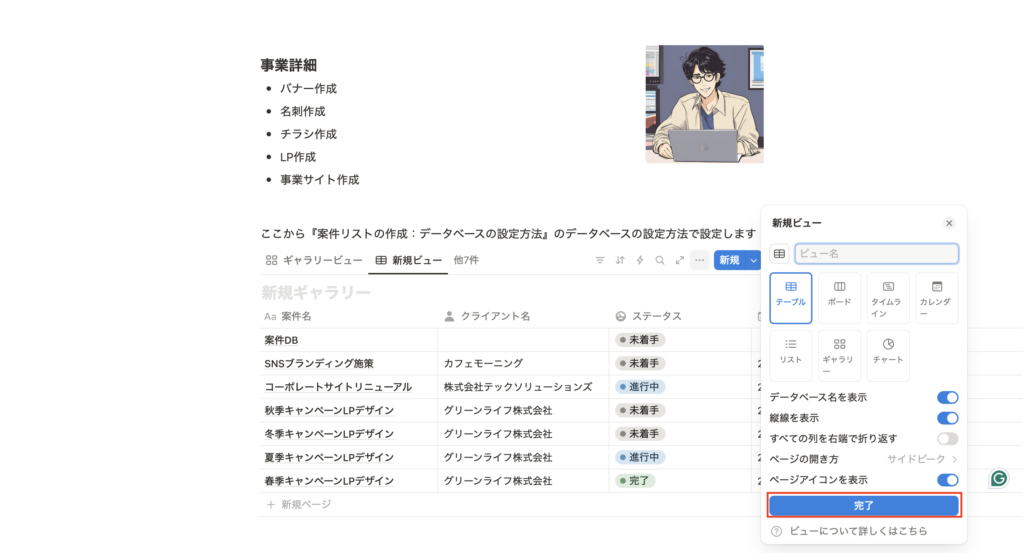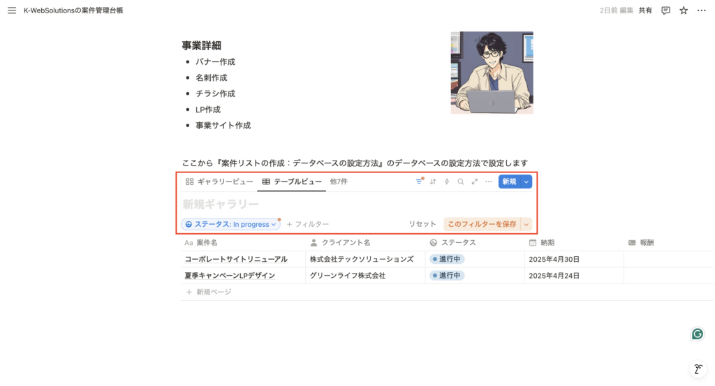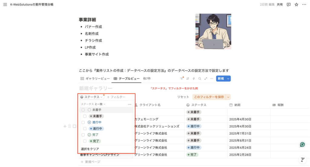 これにより、Notionが”使える台帳”から”使いやすいダッシュボード”へ進化します。