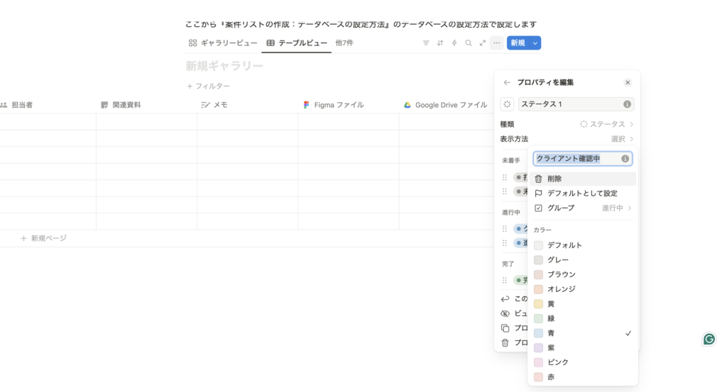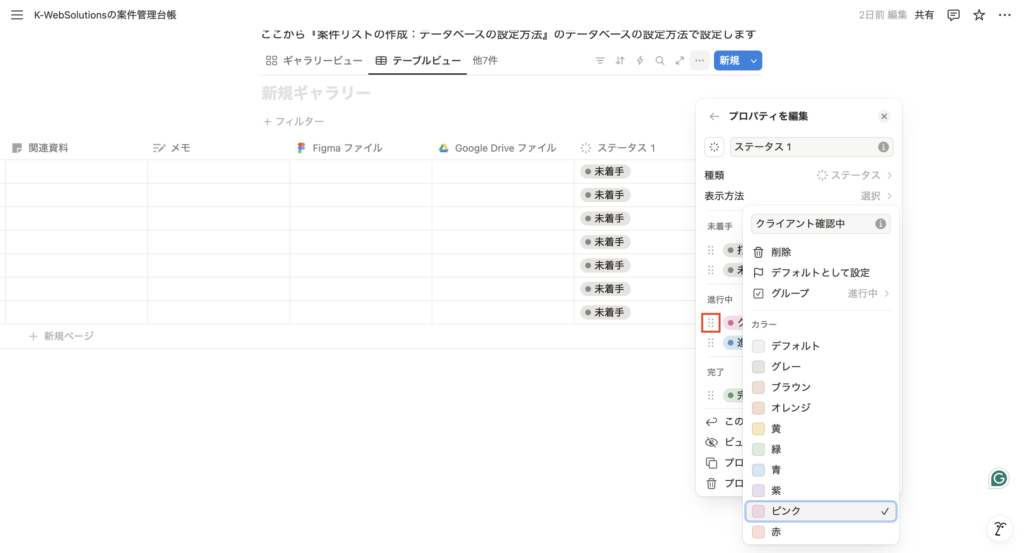 ・例:「ステータス」→セレクト→「未着手」「進行中」「完了」などを追加