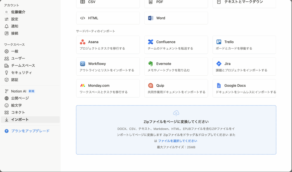 Notionで「/import」もしくは右上の「・・・」からインポートする形式を選ぶことができます。
