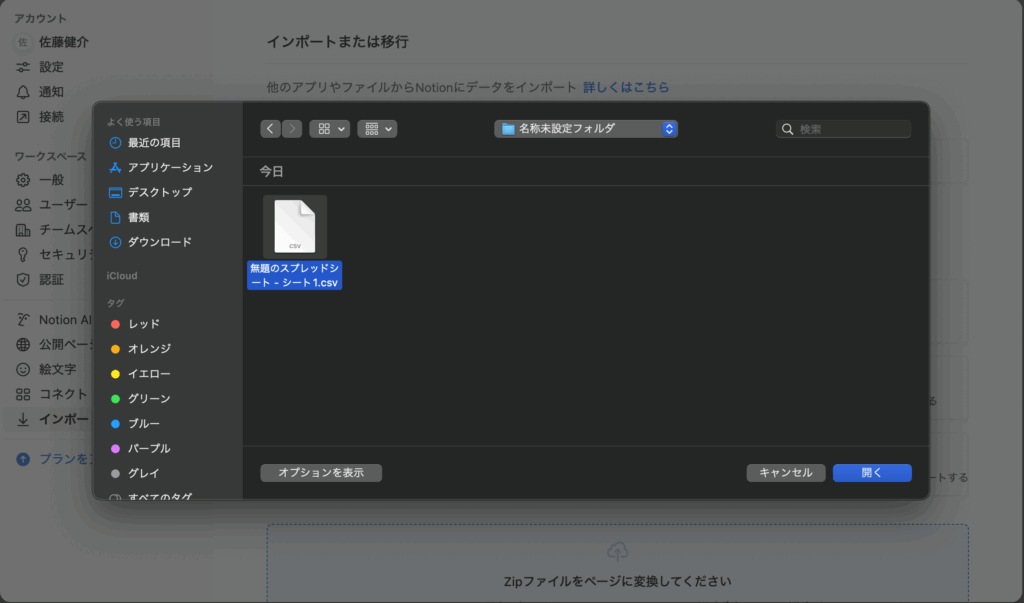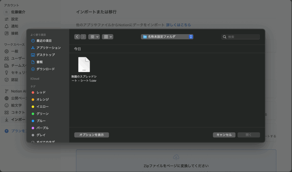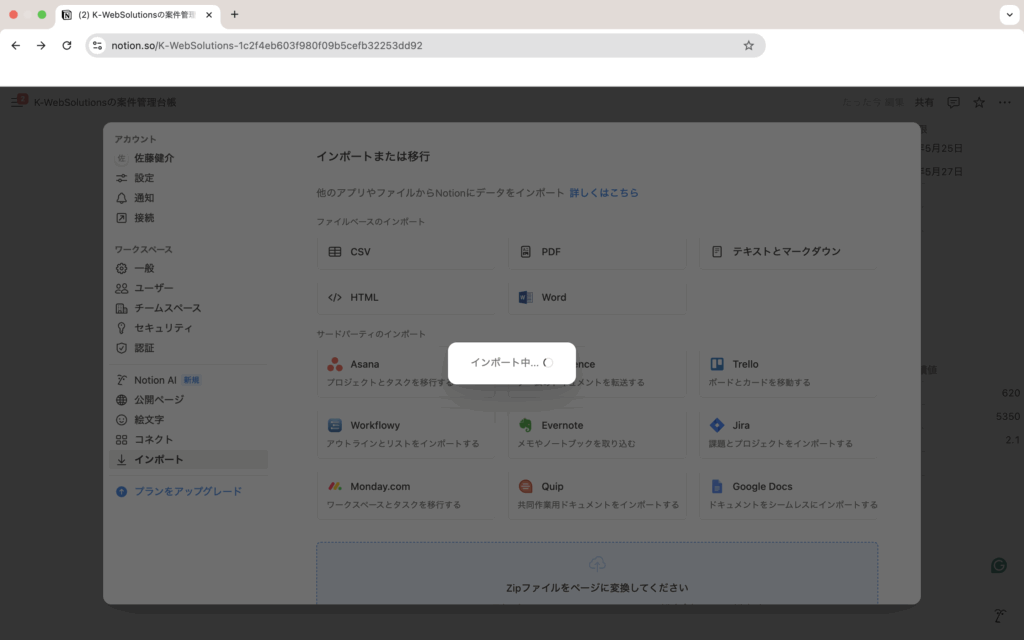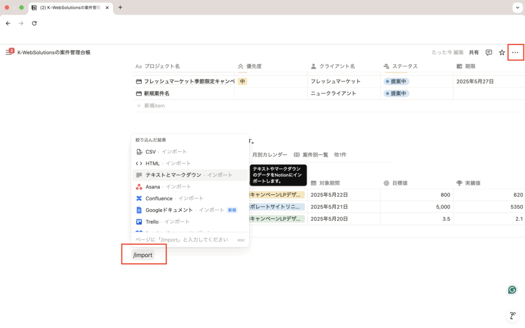 NotionではCSV形式のデータをインポートすることで、既存の案件一覧やクライアント情報などを簡単に取り込むことができます。Excelやスプレッドシートで管理していたデータも、数クリックでNotionのデータベースに変換されるため、移行のハードルが非常に低く、スムーズに作業環境を統一できます。