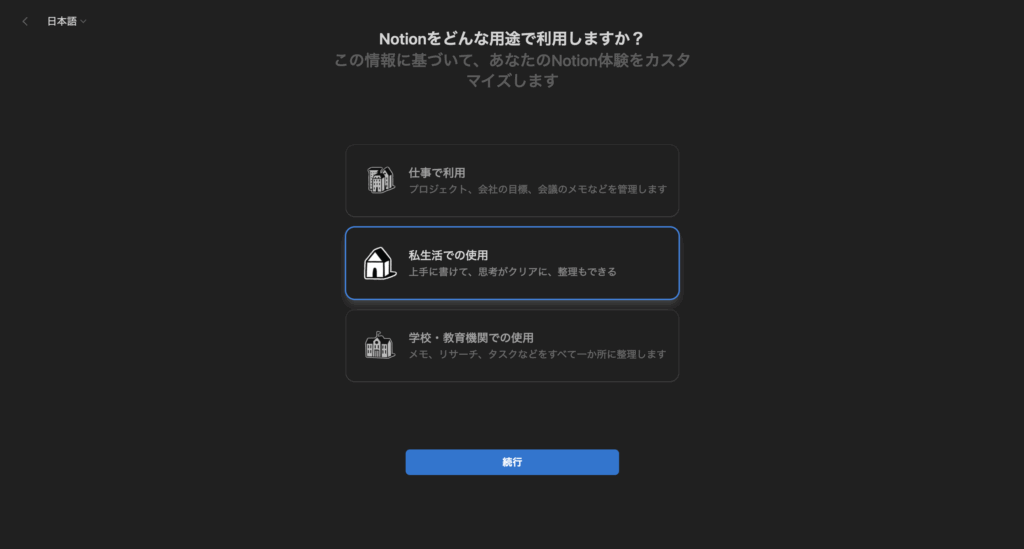 「仕事で利用」「私生活での使用」「学校・教育機関での使用」がありますが、正直どれを選んでいただいても構わないのですが、「私生活での使用」で問題ありません。