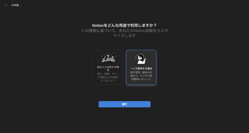「他の人と共有する場合」「一人で使用する場合」を選べますが、「一人で使用する場合」を選んでいただいて問題ございません。